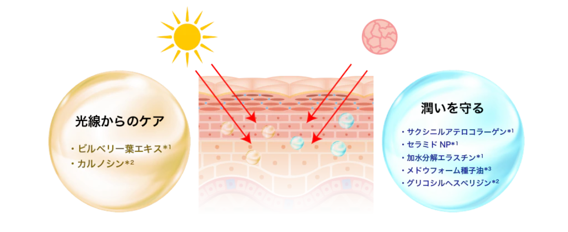 ●光からのケア:ビルベリー葉エキス(保湿成分)/カルノシン(整肌成分)